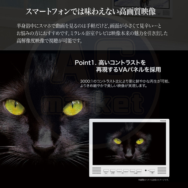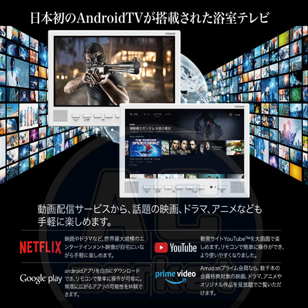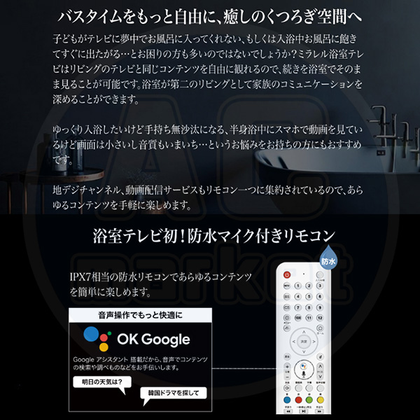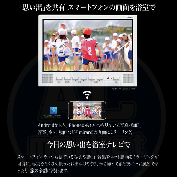 カテゴリ 家電製品 型番 16MBTW 定価 308,000円 販売価格 税込 154,000円 送料 東京・神奈川全域:無料(一部地域や離島を除く) 詳細 ■メーカー:ミラレル ■モデル名:2024年モデル ■タイプ名:Android搭載 浴室テレビ ■OS名:Android ●画面サイズ:16V型(高さ19.4×幅34.4/対角39.4cm) ●モニター寸法:高さ283mm×幅390mm×奥行30mm ■カラー:ホワイト ■電源:AC100V 50/60Hz ■搭載アプリ:NETFLIX / YouTube / Prime Video / Hulu / DAZN / Google playほか ■受信可能放送:地上デジタル放送 / BS / 110度CSデジタル ■年間消費電力:45kWh ■その他機能等 ・画素数:横1920×縦1080 ・使用光源:LED ・視野角:上下左右 各約 80° ・輝度:200 cd/m2 ・コントラスト比:3000:1 ・Bluetooth:4.2/5.0 ・Wi-Fi:2.4GHz/5.0GHz 802.11 a/b/g/n/ac ・実用音声出力:3W+3W ・リモコン:電源:DC3V(単4形乾電池2個使用) ※記載された情報は商品仕様の一部ですので、詳細はメーカーサイトにてご確認ください。 ※標準取付工事、承ります。