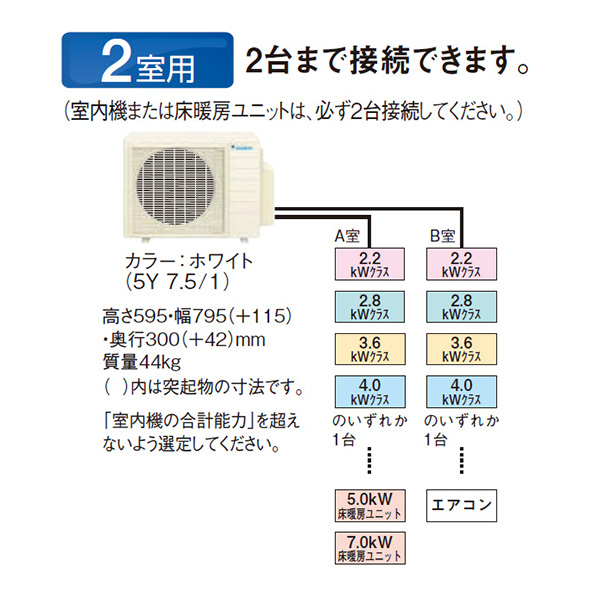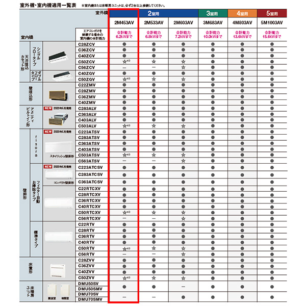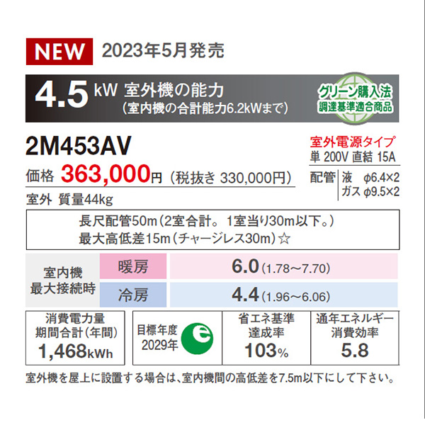 カテゴリ ハウジングエアコン 型番 2M453AV 定価 363,000円 販売価格 税込 137,000円 詳細 ■メーカー:ダイキン ■モデル名:2023年モデル ■タイプ名:システムマルチエアコン(室外機) ■対応室数:2室用 ■室内機合計能力:6.2KWまで ■電源:単相200V ■室内機:なし ■室外機:2M453AV ●室内機サイズ:- ●室外機サイズ:高さ595mm×幅795(+115)mm×奥行300(+42)mm ■期間消費電力量(年間):1468kWh ■その他機能等 ・室外電源 ※記載された情報は商品仕様の一部ですので、詳細はメーカーサイトにてご確認ください。 ※標準取付工事のほか、家電量販店では対応困難な『隠ぺい配管工事』も承ります。