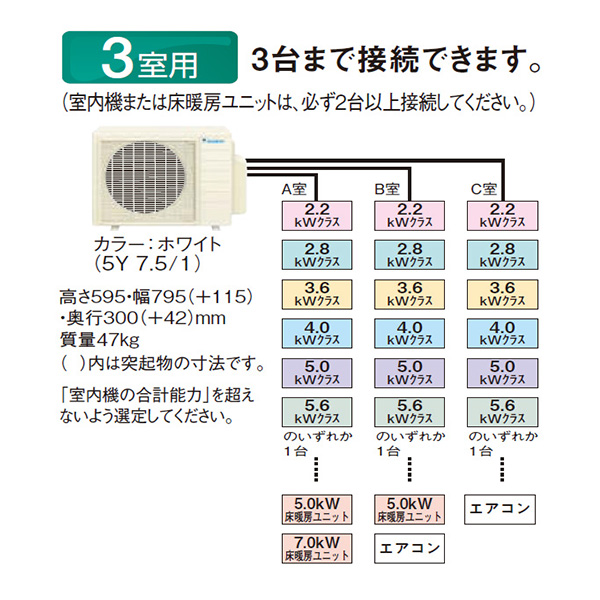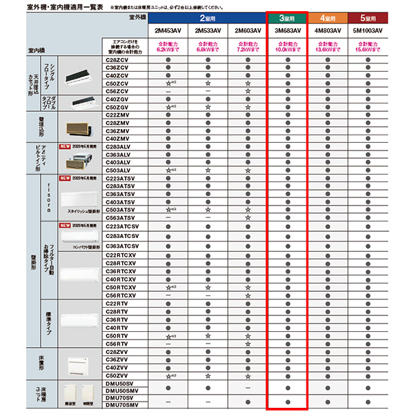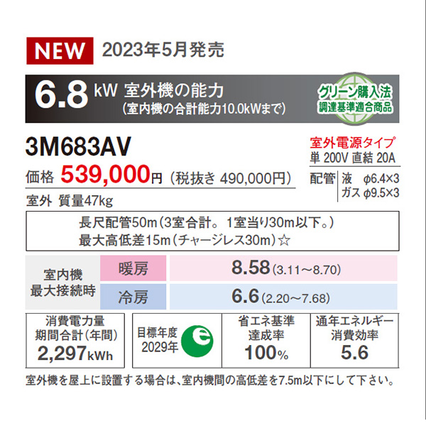 カテゴリ ハウジングエアコン 型番 3M683AV 定価 539,000円 販売価格 税込 202,000円 詳細 ■メーカー:ダイキン ■モデル名:2023年モデル ■タイプ名:システムマルチエアコン(室外機) ■対応室数:3室用 ■室内機合計能力:10.0KWまで ■電源:単相200V ■室内機:なし ■室外機:3M683AV ●室内機サイズ:- ●室外機サイズ:高さ595mm×幅795(+115)mm×奥行300(+42)mm ■期間消費電力量(年間):2297kWh ■その他機能等 ・室外電源 ※記載された情報は商品仕様の一部ですので、詳細はメーカーサイトにてご確認ください。 ※標準取付工事のほか、家電量販店では対応困難な『隠ぺい配管工事』も承ります。