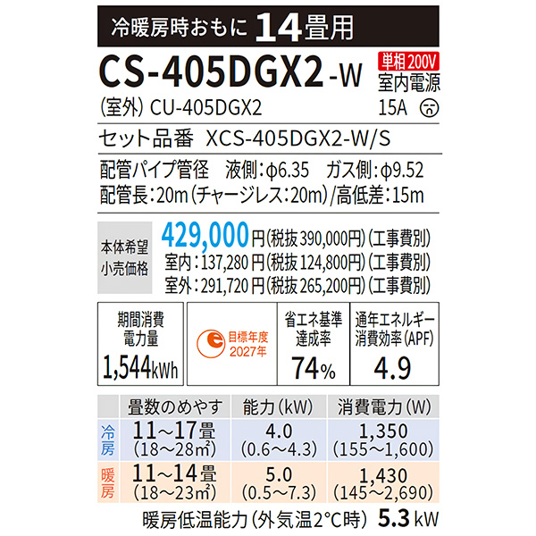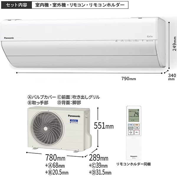 カテゴリ ルームエアコン 型番 CS-405DGX2-W 定価 390,000円 販売価格 税込 167,310円 送料 東京・神奈川全域:無料(一部地域や離島を除く) 詳細 ■メーカー:パナソニック ■モデル名:2025年モデル ■シリーズ名:Eolia GXシリーズ ■適用畳数:14畳用 ■カラー:クリスタルホワイト ■電源:単相200V ■室内機:CS-405DGX2-W ■室外機:CU-405DGX2 ●室内機サイズ:高さ249×幅790×奥行340mm ●室外機サイズ:高さ551mm×幅780(バルブカバー68 / 取っ手部20.5)mm×奥行289(前面:吹き出しグリル39 / 脚部31.5)mm ■期間消費電力量(年間):1544kWh ■その他機能等 ・ナノイーX 48兆 ・空気清浄フィルター ・フィルターお掃除ロボット(BOX) ・ナノイーX内部クリーン ・カビみはり(室内機内部) ・においケア ・除湿(快適/冷房/衣類乾燥) ・おへや学習機能 ・左右風向自動 ※記載された情報は商品仕様の一部ですので、詳細はメーカーサイトにてご確認ください。 ※標準取付工事のほか、家電量販店では対応困難な『隠ぺい配管工事』も承ります。