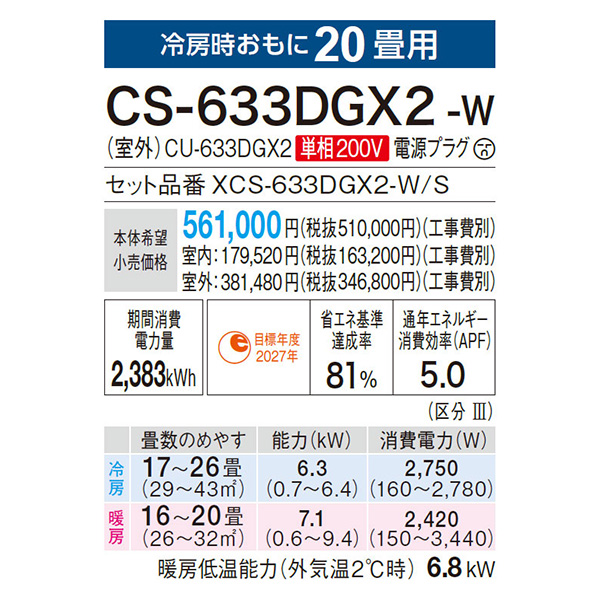 カテゴリ ルームエアコン 型番 CS-633DGX2-W 定価 510,000円 販売価格 税込 236,000円 送料 東京・神奈川全域:無料(一部地域や離島を除く) 詳細 ■メーカー:パナソニック ■モデル名:2023年モデル ■シリーズ名:Eolia GXシリーズ ■適用畳数:20畳用 ■カラー:クリスタルホワイト ■電源:単相200V ■室内機:CS-633DGX2 ■室外機:CU-633DGX2 ●室内機サイズ:高さ249mm×幅790mm×奥行340mm ●室外機サイズ:高さ630mm×幅799(バルブカバー68 / 取っ手部22)mm×奥行299(前面:吹き出しグリル33 / 脚部31)mm ■期間消費電力量(年間):2383kWh ■その他機能等 ・ナノイーX(48兆) ・においケア「ナノイーX」送風おでかけクリーン ・内部クリーン(冷房時・暖房時) ・AI自動運転(AIモード) ・熱交換器コーティング(ホコリレス親水) ・フィルターお掃除ロボット(ダストボックス) ・カビみはり(内部) ・1/fゆらぎ ・おへや学習機能 ※記載された情報は商品仕様の一部ですので、詳細はメーカーサイトにてご確認ください。 ※標準取付工事のほか、家電量販店では対応困難な『隠ぺい配管工事』も承ります。