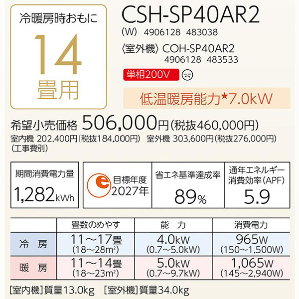 CSH-SP40AR2-W コロナ ルームエアコン ReLaLa SPシリーズ 主に14畳用 ホワイト 2024年モデル