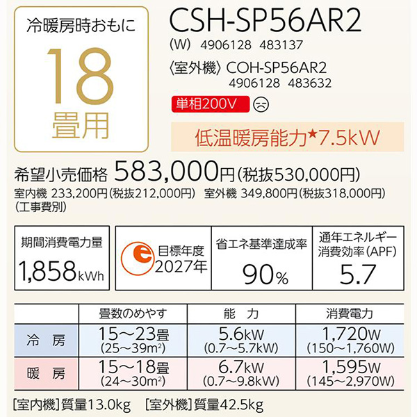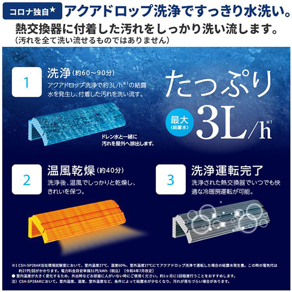 カテゴリ ルームエアコン 型番 CSH-SP56AR2-W 定価 530,000円 販売価格 税込 206,000円 送料 東京・神奈川全域:無料(一部地域や離島を除く) 詳細 ■メーカー:コロナ ■モデル名:2024年モデル ■シリーズ名:ReLaLa SPシリーズ ■適用畳数:18畳用 ■カラー:ホワイト ■電源:単相200V ■室内機:CSH-SP56AR2-W ■室外機:COH-SP56AR2 ●室内機サイズ:高さ295mm×幅797mm×奥行369mm ●室外機サイズ:高さ675mm×幅792(+87)mm×奥行310mm ■期間消費電力量(年間):1858kWh ■その他機能等 ・自動運転 ・よごれま扇 ・アクアドロップ洗浄 ・フィルター自動おそうじ ・内部乾燥モード ・人感センサー ・ノンストップ暖房&暖速モード ・ニオイカット制御 ・除菌 ※記載された情報は商品仕様の一部ですので、詳細はメーカーサイトにてご確認ください。 ※標準取付工事のほか、家電量販店では対応困難な『隠ぺい配管工事』も承ります。