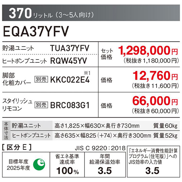 カテゴリ 住宅設備 型番 EQA37YFV 定価 1,180,000円 販売価格 税込 455,000円 送料 東京・神奈川全域:無料(一部地域や離島を除く) 詳細 ■メーカー:ダイキン ■モデル名:2024年モデル ■シリーズ名:エコキュート 角型 フルオート Aシリーズ ■適用人数:3~5人用 ■貯湯ユニットタンク容量:370L ■電源:単相200V ■貯湯ユニット:TUA37YFV ■ヒートポンプユニット:RQW45YV ●貯湯ユニットサイズ:高さ1825mm×幅630mm×奥行き730mm ●ヒートポンプユニットサイズ:高さ635mm×幅825(+74)mm×奥行き300mm ■給湯保温効率(年間):3.5 ■その他機能等 ・フルオートタイプ ・おゆぴかUV ・自動ふろ配管洗浄 ・ツイン給湯 ・パワフル高圧給湯(330kPa) ・温浴タイム ・沸き増し ・昼間シフト機能 ・自動保温 ※記載された情報は商品仕様の一部ですので、詳細はメーカーサイトにてご確認ください。 ※標準取付工事、承ります