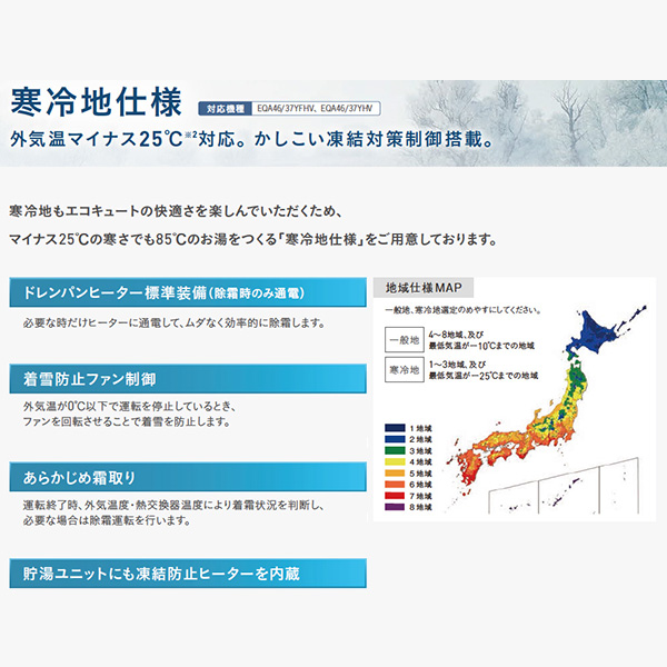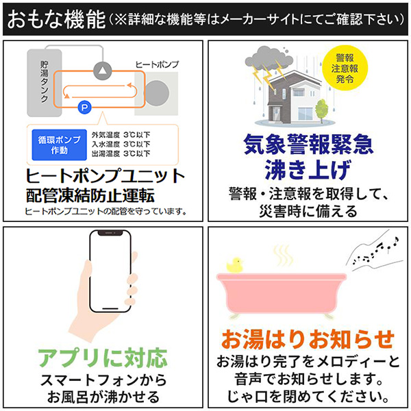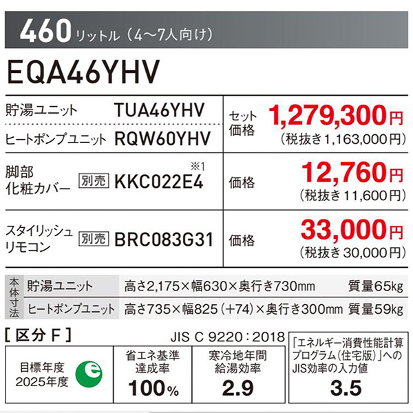 カテゴリ 住宅設備 型番 EQA46YHV 定価 1,163,000円 販売価格 税込 449,000円 送料 東京・神奈川全域:無料(一部地域や離島を除く) 詳細 ■メーカー:ダイキン ■モデル名:2024年モデル ■シリーズ名:エコキュート 角型 給湯専用らく Aシリーズ ■適用人数:4~7人用 ■貯湯ユニットタンク容量:460L ■電源:単相200V ■貯湯ユニット:TUA46YHV ■ヒートポンプユニット:RQW60YHV ●貯湯ユニットサイズ:高さ2175mm×幅630mm×奥行き730mm ●ヒートポンプユニットサイズ:高さ735mm×幅825(+74)mm×奥行き300mm ■給湯保温効率(年間):2.9 ■その他機能等 ・給湯専用らくタイプ ・寒冷地仕様 ・スマート貯湯 ・ターボ沸き上げ ・沸き増し能力アップ ・あらかじめ霜取り ・パワフル高圧給湯(330kPa) ・昼間シフト機能 ・エコ確認 ※記載された情報は商品仕様の一部ですので、詳細はメーカーサイトにてご確認ください。 ※標準取付工事、承ります