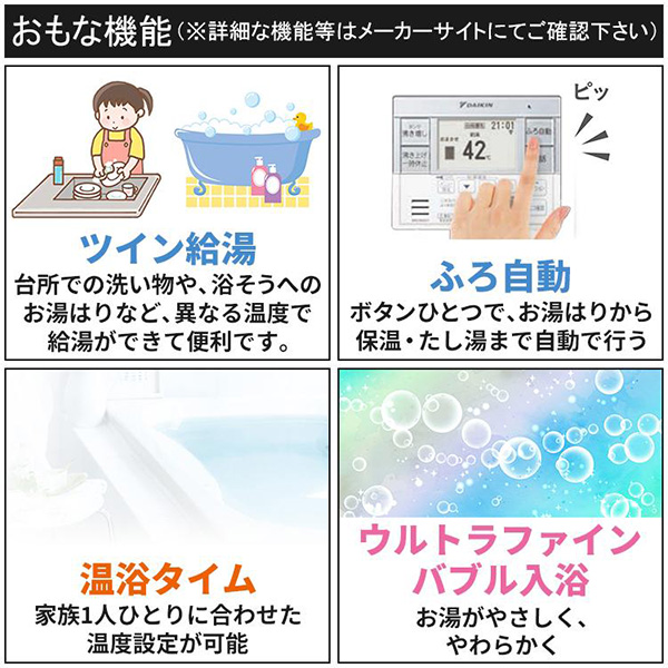 カテゴリ 住宅設備 型番 EQN46YFV 定価 1,220,000円 販売価格 税込 470,000円 送料 東京・神奈川全域:無料(一部地域や離島を除く) 詳細 ■メーカー:ダイキン ■モデル名:2024年モデル ■シリーズ名:エコキュート 角型 フルオート Nシリーズ ■適用人数:4~7人用 ■貯湯ユニットタンク容量:460L ■電源:単相200V ■貯湯ユニット:TUN46YFV ■ヒートポンプユニット:RQW60YV ●貯湯ユニットサイズ:高さ2175mm×幅630mm×奥行き730mm ●ヒートポンプユニットサイズ:高さ635mm×幅825(+74)mm×奥行き300mm ■給湯保温効率(年間):3.5 ■その他機能等 ・フルオートタイプ ・自動ふろ配管洗浄 ・ふろ配管洗浄 ・ツイン給湯 ・ウルトラファインバブル入浴(オプション機能) ・温浴タイム ・昼間シフト機能 ・自動保温 ・追いだき ※記載された情報は商品仕様の一部ですので、詳細はメーカーサイトにてご確認ください。 ※標準取付工事、承ります