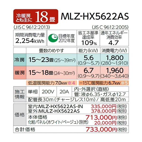 カテゴリ ハウジングエアコン 型番 MLZ-HX5622AS 定価 733,000円 販売価格 税込 362,000円 送料 東京・神奈川全域:無料(一部地域や離島を除く) 詳細 ■メーカー:三菱電機 ■モデル名:2022年モデル ■タイプ名:天井埋込形1方向 ■シリーズ名:霧ヶ峰 ズバ暖 HXシリーズ ■適用畳数:18畳用 ■電源:単相200V ■室内機:MLZ-HX5622AS-IN ■室外機:MUFZ-HX5622AS ●室内機サイズ:高さ185mm×幅1102mm×奥行360mm ●室外機サイズ:高さ630mm×幅809(+62)mm×奥行300(+60)mm ■期間消費電力量(年間):2254kWh ■その他機能等 ・寒冷地仕様 ・高温みまもり ・長時間連続暖房 ・室温キープシステム ・凍結防止ヒーター ・STRONG冷房 ・上下左右涼感スイング ・選べる3モード除湿 ・空清Vフィルター ※記載された情報は商品仕様の一部ですので、詳細はメーカーサイトにてご確認ください。 ※標準取付工事のほか、家電量販店では対応困難な『隠ぺい配管工事』も承ります。