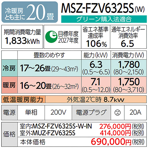カテゴリ ルームエアコン 型番 MSZ-FZV6325S-W 定価 759,000円 販売価格 税込 337,000円 送料 東京・神奈川全域:無料(一部地域や離島を除く) 詳細 ■メーカー:三菱電機 ■モデル名:2025年モデル ■シリーズ名:霧ヶ峰 FZシリーズ ■適用畳数:20畳用 ■カラー:ピュアホワイト ■電源:単相200V ■室内機:MSZ-FZV6325S-W-IN ■室外機:MUZ-FZV6325S ●室内機サイズ:高さ285mm×幅890mm×奥行358(据付後363)mm ●室外機サイズ:高さ714mm×幅800(+62)mm×奥行285(+60)mm ■期間消費電力量(年間):1833kWh ■その他機能等 ・エモコアイ ・ムーブアイmirA.I.+ ・A.I.自動 ・A.I.(ハイブリッド運転) ・A.I.(自動風あて・風よけ) ・ピュアミスト ・プレミアム除湿 ・フィルター自動お掃除(はずせる) ・省エネNo.1 ※記載された情報は商品仕様の一部ですので、詳細はメーカーサイトにてご確認ください。 ※標準取付工事のほか、家電量販店では対応困難な『隠ぺい配管工事』も承ります。
