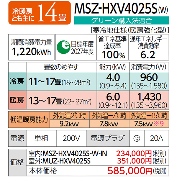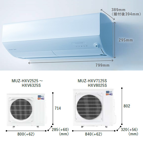 カテゴリ ルームエアコン 型番 MSZ-HXV4025S-W 定価 585,000円 販売価格 税込 272,000円 送料 東京・神奈川全域:無料(一部地域や離島を除く) 詳細 ■メーカー:三菱電機 ■モデル名:2025年モデル ■シリーズ名:霧ヶ峰 ズバ暖 HXVシリーズ ■適用畳数:14畳用 ■カラー:ピュアホワイト ■電源:単相200V ■室内機:MSZ-HXV4025S-W-IN ■室外機:MUZ-HXV4025S ●室内機サイズ:高さ295mm×幅799mm×奥行389(据付後394)mm ●室外機サイズ:高さ714mm×幅800(+62)mm×奥行285(+60)mm ■期間消費電力量(年間):1220kWh ■その他機能等 ・寒冷地仕様 ・エモコアイ ・ムーブアイmirA.I.+ ・A.I.自動 ・A.I.(ハイブリッド運転) ・ピュアミスト/ヘルスエアー機能 ・さらっと除湿冷房 ・フィルター自動お掃除(はずせる) ・暖房強化プレミアムモデル ※記載された情報は商品仕様の一部ですので、詳細はメーカーサイトにてご確認ください。 ※標準取付工事のほか、家電量販店では対応困難な『隠ぺい配管工事』も承ります。