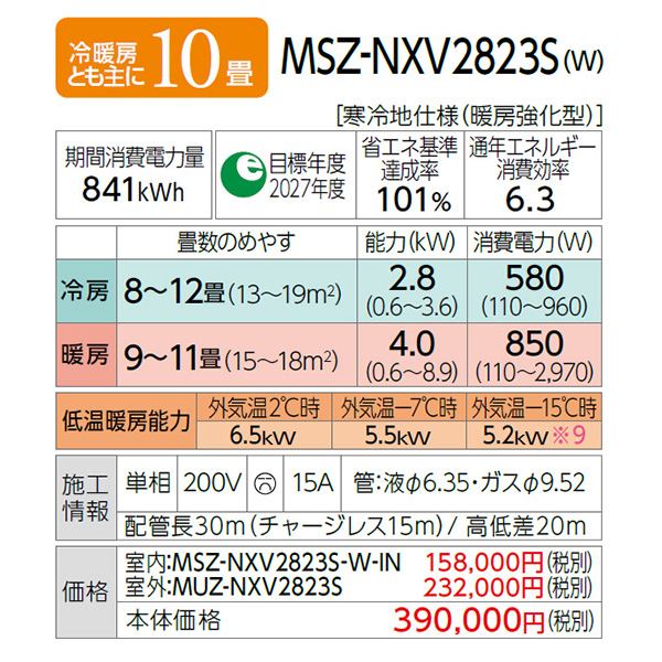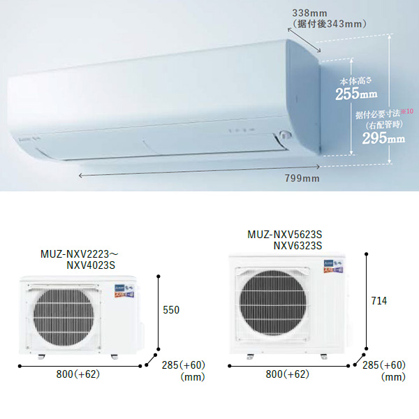 カテゴリ ルームエアコン 型番 MSZ-NXV2823S-W 定価 390,000円 販売価格 税込 175,000円 送料 東京・神奈川全域:無料(一部地域や離島を除く) 詳細 ■メーカー:三菱電機 ■モデル名:2023年モデル ■シリーズ名:霧ヶ峰 ズバ暖 NXVシリーズ ■適用畳数:10畳用 ■カラー:ピュアホワイト ■電源:単相200V ■室内機:MSZ-NXV2823S-W-IN ■室外機:MUZ-NXV2823S ●室内機サイズ:高さ255mm×幅799mm×奥行338(据付後343)mm ●室外機サイズ:高さ550mm×幅800(+62)mm×奥行285(+60)mm ■期間消費電力量(年間):841kWh ■その他機能等 ・寒冷地仕様 ・ムーブアイ ・ハイブリット運転 ・室温キープシステム ・長時間連続暖房 ・STRONG冷房 ・スマート除湿 ・内部クリーン・スタート脱臭 ・高温みまもり ※記載された情報は商品仕様の一部ですので、詳細はメーカーサイトにてご確認ください。 ※標準取付工事のほか、家電量販店では対応困難な『隠ぺい配管工事』も承ります。