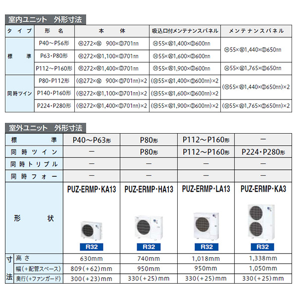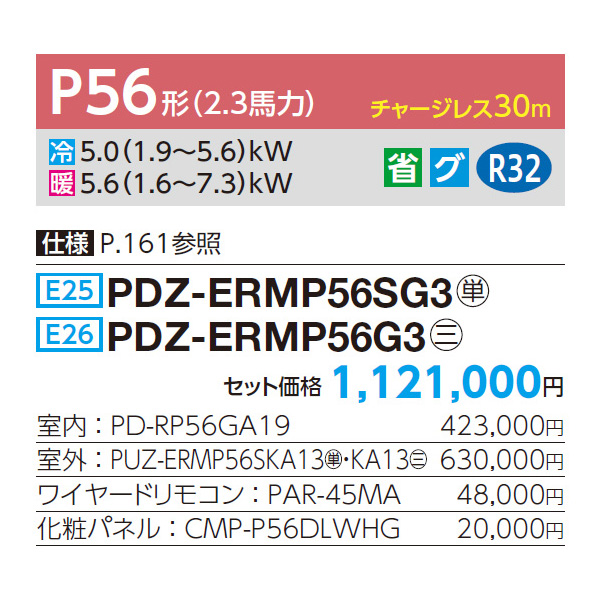 カテゴリ 業務用エアコン 型番 PDZ-ERMP56SG3 / PDZ-ERMP56G3 定価 1,233,100円 販売価格 税込 260,000円 送料 東京・神奈川全域:無料(一部地域や離島を除く) 詳細 ■メーカー:三菱電機 ■モデル名:2023年モデル ■タイプ名:パッケージエアコン / ビルトイン / スリムER / シングル(室内機1台×室外機1台) ■能力:2.3馬力(P56形) /【平米数】33~49㎡ /【坪数】10~14坪 /【畳数】20~28畳 ■電源:単相200V / 三相200V ■室内機:PD-RP56GA19 ■室外機:PUZ-ERMP56SKA13 / PUZ-ERMP56KA13 ●室内機サイズ:高さ272mm×幅900mm×奥行701mm ●室外機サイズ:高630mm×幅809(+62)mm×奥行300(+23)mm ■通年エネルギー消費効率:4.8 ■その他機能等 ・ワイヤード ・ハイパワー運転 ・冷暖自動運転 ・風速自動 ・ドライ運転 ・パワーシェア運転 ・暖房プレヒート ・風速ノッチ3 ・ホットスタート ※記載された情報は商品仕様の一部ですので、詳細はメーカーサイトにてご確認ください。 ※標準取付工事のほか、家電量販店では対応困難な『隠ぺい配管工事』も承ります。