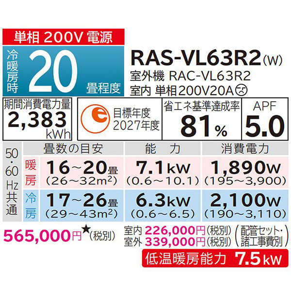 RAS-VL63R2-W ルームエアコン