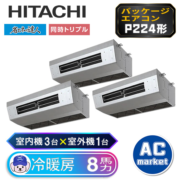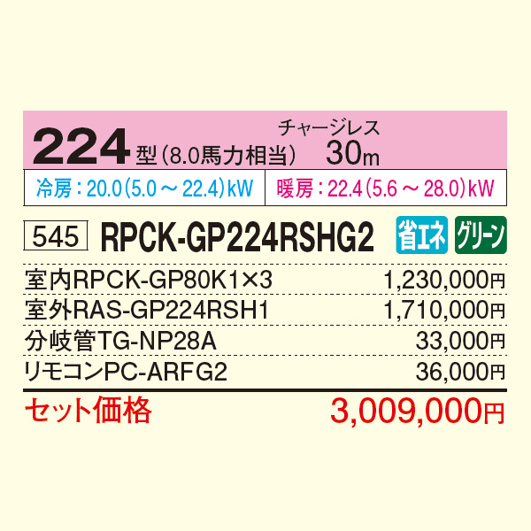 カテゴリ 業務用エアコン 型番 RPCK-GP224RSHG2 定価 3,309,900円 販売価格 税込 696,000円 送料 東京・神奈川全域:無料(一部地域や離島を除く) 詳細 ■メーカー:日立 ■モデル名:2023年モデル ■タイプ名:パッケージエアコン / 厨房用 / 省エネの達人 / トリプル(室内機3台×室外機1台) ■能力:8馬力(P224形) /【平米数】132~195㎡ /【坪数】40~59坪 /【畳数】80~118畳 ■電源:三相200V ■室内機:RPCK-GP80K1 x3 ■室外機:RAS-GP224RSH1 ●室内機サイズ:高さ295mm×幅1136mm×奥行650mm ●室外機サイズ:高さ1380mm×幅950mm×奥行370mm ■通年エネルギー消費効率:4.6 ■その他機能等 ・ワイヤード ・熱交換器(凍結洗浄) ・風量調整4段 ・ドライ ・ホットスタート ・冷房外気(-5℃) ・タイマー運転 ・遠方/集中制御対応 ・全熱交連動運転対応 ※記載された情報は商品仕様の一部ですので、詳細はメーカーサイトにてご確認ください。 ※標準取付工事のほか、家電量販店では対応困難な『隠ぺい配管工事』も承ります。
