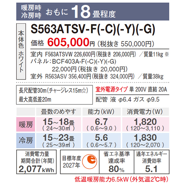 カテゴリ ルームエアコン 型番 S563ATSV-Y 定価 550,000円 販売価格 税込 222,000円 送料 東京・神奈川全域:無料(一部地域や離島を除く) 詳細 ■メーカー:ダイキン ■モデル名:2023年モデル ■シリーズ名:risora SXシリーズ ■適用畳数:18畳用 ■カラー:ストーンベージュ ■電源:単相200V ■室内機:F223ATSSW / パネル(BCF403A-Y) ■室外機:R563ASV ●室内機サイズ:高295mm×幅798mm×奥行185mm ●室外機サイズ:高610mm×幅795(+78)mm×奥行300(+42)mm ■期間消費電力量(年間):2077kWh ■その他機能等 ・室外電源 ・プレミアム冷房 ・PIT制御 ・タフネス冷房・暖房 ・さらら除湿 ・自動運転 ・垂直気流 ・風ないス運転 ・ロング気流 ※記載された情報は商品仕様の一部ですので、詳細はメーカーサイトにてご確認ください。 ※標準取付工事のほか、家電量販店では対応困難な『隠ぺい配管工事』も承ります。