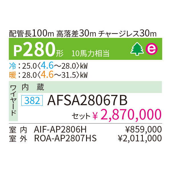 カテゴリ 業務用エアコン 型番 AFSA28067B 定価 3,157,000円 販売価格 税込 664,000円 詳細 ■メーカー:東芝 ■モデル名:2021年モデル ■タイプ名:パッケージエアコン / 床置き形 / シングル(室内機1台×室外機1台) / スーパーパワーエコゴールド ■能力:10馬力(P280形) /【平米数】165~243㎡ /【坪数】50~73坪 /【畳数】100~146畳 ■電源:三相200V ■室内機:AIF-AP2806H ■室外機:ROA-AP2807HS ●室内機サイズ:高さ1750mm×幅1100mm×奥行450mm ●室外機サイズ:高さ1550mm×幅1010mm×奥行370mm ■通年エネルギー消費効率:4.7 ■その他機能等 ・ワイヤード ・ホットスタート ・風量切換(3段階) ・冷暖自動運転 ・ドライ運転 ・セーブ運転 ・タイマー運転 ・熱交換ユニット連動 ・自動静音モード(室外機) ※記載された情報は商品仕様の一部ですので、詳細はメーカーサイトにてご確認ください。 ※標準取付工事のほか、家電量販店では対応困難な『隠ぺい配管工事』も承ります。