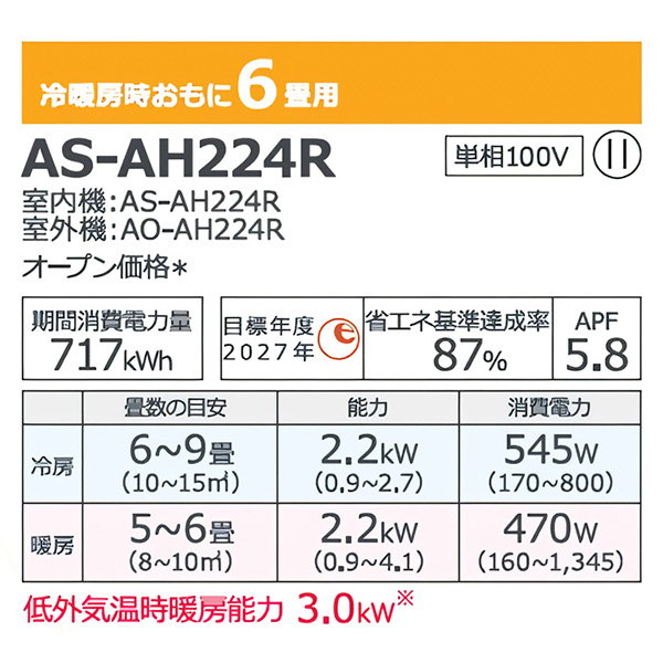 AS-AH224R-W 富士通ゼネラル ルームエアコン nocria AHシリーズ 主に6畳 ホワイト 2024年モデル
