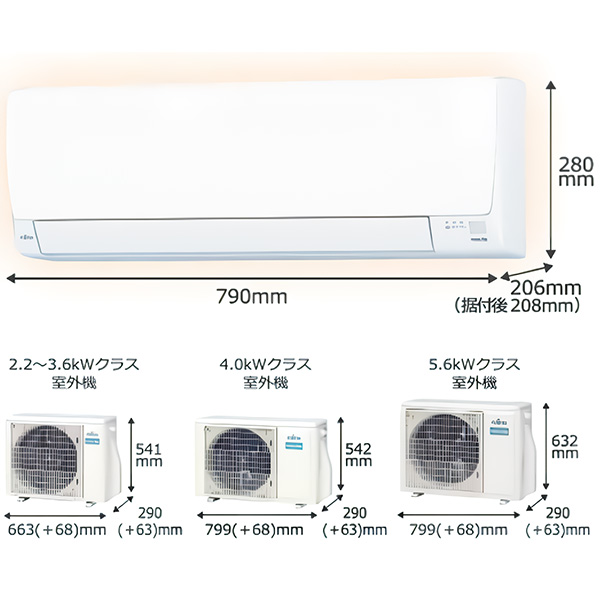 ●室内機サイズ:高さ280mm×幅790mm×奥行206(据付後287)mm