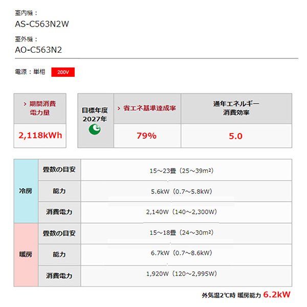カテゴリ ルームエアコン 型番 AS-C563N2-W 定価 オープン価格 販売価格 税込 131,000円 送料 東京・神奈川全域:無料(一部地域や離島を除く) 詳細 ■メーカー:富士通ゼネラル ■モデル名:2023年モデル ■シリーズ名:nocria Cシリーズ ■適用畳数:18畳用 ■カラー:ホワイト ■電源:単相200V ■室内機:AS-C563N2-W ■室外機:AO-C563N2 ●室内機サイズ:高さ250mm×幅728mm×奥行285(据付後287)mm ●室外機サイズ:高さ632mm×幅799(+68)mm×奥行290(63)mm ■期間消費電力量(年間):2118kWh ■その他機能等 ・0.5℃刻み温度設定 ・パワーディフューザー ・ロング気流(冷12m / 暖10m) ・スイング(上下左右) ・ホットキープ除霜 ・除湿(ソフトクール / ひかえめ) ・室温センサー ・内部クリーン ・熱交換器加熱除菌 ※記載された情報は商品仕様の一部ですので、詳細はメーカーサイトにてご確認ください。 ※標準取付工事のほか、家電量販店では対応困難な『隠ぺい配管工事』も承ります。