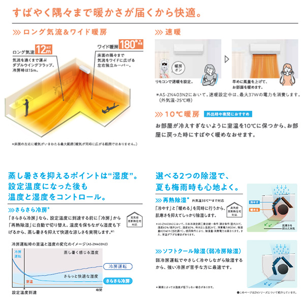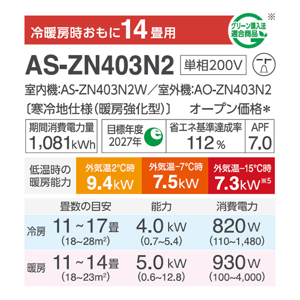 カテゴリ ルームエアコン 型番 AS-ZN403N2-W 定価 オープン価格 販売価格 税込 285,000円 送料 東京・神奈川全域:無料(一部地域や離島を除く) 詳細 ■メーカー:富士通ゼネラル ■モデル名:2023年モデル ■シリーズ名:nocria ゴク暖 ZNシリーズ ■適用畳数:14畳用 ■カラー:ホワイト ■電源:単相200V ■室内機:AS-ZN403N2-W ■室外機:AO-ZN403N2 ●室内機サイズ:高さ293mm×幅798mm×奥行385(据付後390)mm ●室外機サイズ:高さ716mm×幅820(+68)mm×奥行315(+38)mm ■期間消費電力量(年間):1081kWh ■その他機能等 ・寒冷地仕様 ・ダブルAI ・さらさら冷房 ・再熱除湿(強・標準・弱) ・速暖 ・バイパス暖房 ・ホットキープ&クイック除霜 ・プラズマ空清 ・フィルター自動おそうじ ※記載された情報は商品仕様の一部ですので、詳細はメーカーサイトにてご確認ください。 ※標準取付工事のほか、家電量販店では対応困難な『隠ぺい配管工事』も承ります。