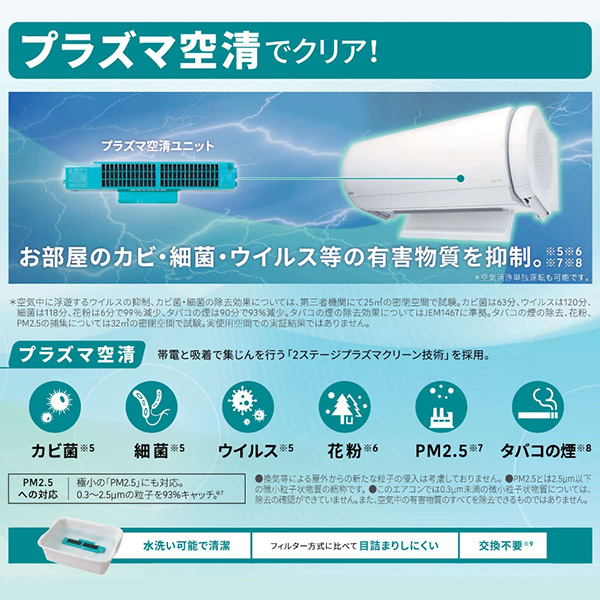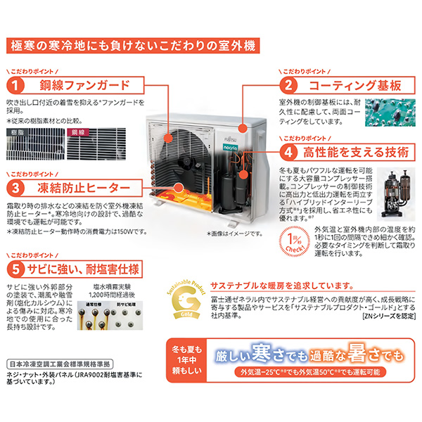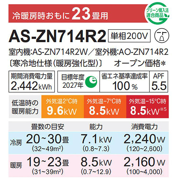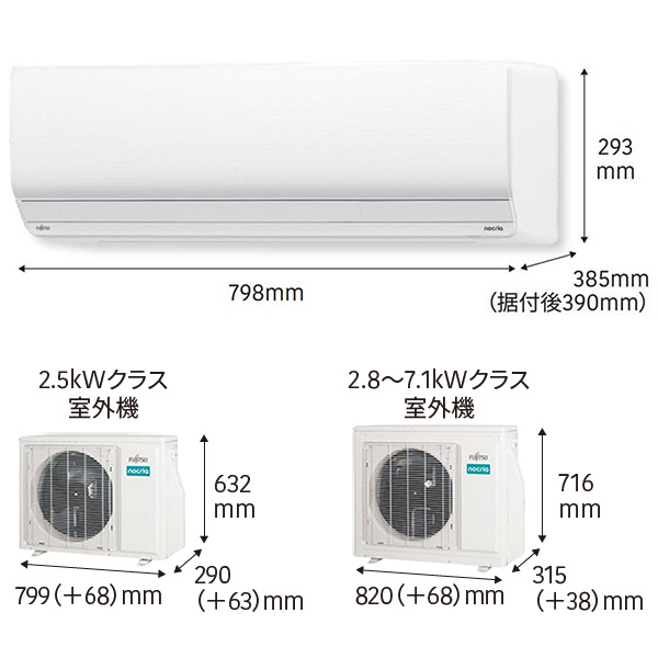 カテゴリ ルームエアコン 型番 AS-ZN714R2-W 定価 オープン価格 販売価格 税込 383,000円 送料 東京・神奈川全域:無料(一部地域や離島を除く) 詳細 ■メーカー:富士通ゼネラル ■モデル名:2024年モデル ■シリーズ名:nocria ゴク暖 ZNシリーズ ■適用畳数:23畳用 ■カラー:ホワイト ■電源:単相200V ■室内機:AS-ZN714R2-W ■室外機:AO-ZN714R2 ●室内機サイズ:高さ293mm×幅798mm×奥行385(据付後390)mm ●室外機サイズ:高さ716mm×幅820(+68)mm×奥行315(+38)mm ■期間消費電力量(年間):2442kWh ■その他機能等 ・寒冷地仕様 ・ダブルAI ・あったかアップ ・バイパス暖房 ・ホットキープ&クイック除霜 ・さらさら冷房 ・除湿(再熱/ソフトクール) ・プラズマ空清 ・フィルター自動おそうじ ※記載された情報は商品仕様の一部ですので、詳細はメーカーサイトにてご確認ください。 ※標準取付工事のほか、家電量販店では対応困難な『隠ぺい配管工事』も承ります。