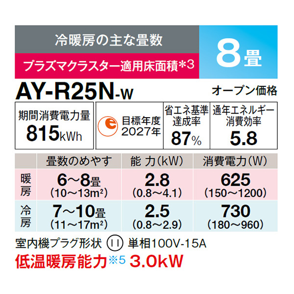 AY-R25N-W シャープ ルームエアコン R-Nシリーズ プラズマクラスター7000 主に8畳 ホワイト 単相100V 2023年モデル