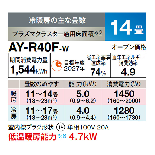 カテゴリ ルームエアコン 型番 AY-R40F-W 定価 オープン価格 販売価格 税込 148,000円 送料 東京・神奈川全域:無料(一部地域や離島を除く) 詳細 ■メーカー:シャープ ■モデル名:2023年モデル ■シリーズ名:プラズマクラスター R-Fシリーズ ■適用畳数:14畳用 ■カラー:ホワイト ■電源:単相100V ■室内機:AY-R40F-W ■室外機:AU-R40FY ●室内機サイズ:高さ268mm×幅790mm×奥行289mm ●室外機サイズ:高さ540mm×幅670(+配管カバー部57)mm×奥行280(脚含326)mm ■期間消費電力量(年間):1544kWh ■その他機能等 ・プラズマクラスター25000搭載 ・COCORO AIR搭載 ・除湿(氷結ドライ / コアンダ除湿) ・上下反転ルーバー気流制御 ・すこやかシャワー気流 ・プレウォーム制御 ・部屋干し ・フィルター自動掃除 ・内部洗浄 ※記載された情報は商品仕様の一部ですので、詳細はメーカーサイトにてご確認ください。 ※標準取付工事のほか、家電量販店では対応困難な『隠ぺい配管工事』も承ります。