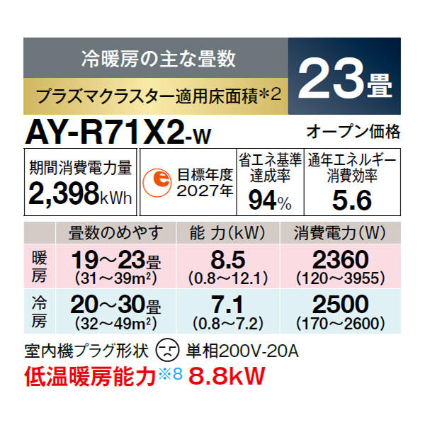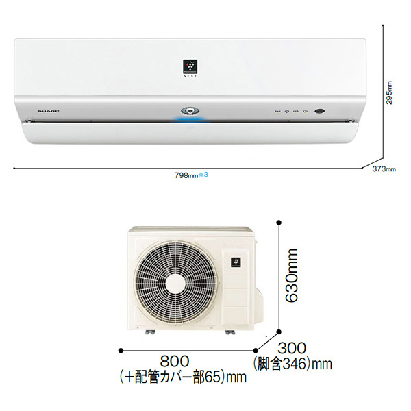 カテゴリ ルームエアコン 型番 AY-R71X2-W 定価 オープン価格 販売価格 税込 266,000円 送料 東京・神奈川全域:無料(一部地域や離島を除く) 詳細 ■メーカー:シャープ ■モデル名:2023年モデル ■シリーズ名:プラズマクラスター R-Xシリーズ ■適用畳数:23畳用 ■カラー:ホワイト ■電源:単相200V ■室内機:AY-R71X2-W ■室外機:AU-R71X2Y ●室内機サイズ:高さ295mm×幅798mm×奥行373mm ●室外機サイズ:高さ630mm×幅800(+配管カバー部65)mm×奥行300(脚含346)mm ■期間消費電力量(年間):2398kWh ■その他機能等 ・プラズマクラスターNEXT搭載 ・業界唯一 CO2センサー搭載 ・COCORO AIR搭載 ・除湿(氷結ドライ / コアンダ除湿) ・匠の冷房 ・風クリーンシステム ・部屋干しモード ・フィルター自動掃除 ・内部洗浄 ※記載された情報は商品仕様の一部ですので、詳細はメーカーサイトにてご確認ください。 ※標準取付工事のほか、家電量販店では対応困難な『隠ぺい配管工事』も承ります。