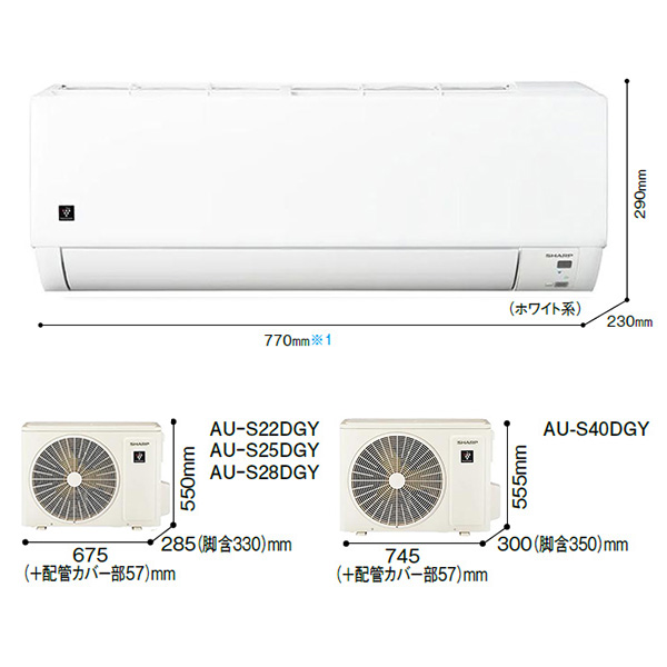 特記 東京ゼロエミポイント対象機種 カテゴリ ルームエアコン 型番 AY-S25DG-W 定価 オープン価格 販売価格 税込 76,000円 送料 東京・神奈川全域:無料(一部地域や離島を除く) 詳細 ■メーカー:シャープ ■モデル名:2024年モデル ■シリーズ名:DGシリーズ ■適用畳数:8畳用 ■カラー:ホワイト ■電源:単相100V ■室内機:AY-S25DG ■室外機:AUーS25DGY ●室内機サイズ:高さ290mm×幅770mm×奥行230mm ●室外機サイズ:高さ550mm×幅675(+配管カバー部57)mm×奥行285(脚含330)mm ■期間消費電力量(年間):815kWh ■その他機能等 ・プラズマクラスター7000 ・プラズマクラスター送風運転 ・ハニカムフィルター ・コアンダ除湿 ・すこやかシャワー気流 ・コアンダ気流制御 ・親水性コート熱交換 ・内部清浄 ・おやすみ切タイマー ※記載された情報は商品仕様の一部ですので、詳細はメーカーサイトにてご確認ください。 ※標準取付工事のほか、家電量販店では対応困難な『隠ぺい配管工事』も承ります。
