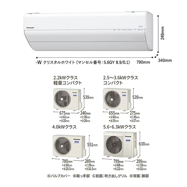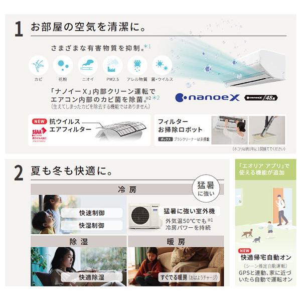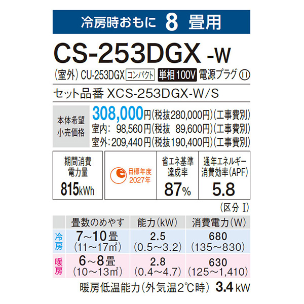 カテゴリ ルームエアコン 型番 CS-253DGX-W 定価 280,000円 販売価格 税込 130,000円 送料 東京・神奈川全域:無料(一部地域や離島を除く) 詳細 ■メーカー:パナソニック ■モデル名:2023年モデル ■シリーズ名:Eolia GXシリーズ ■適用畳数:8畳用 ■カラー:クリスタルホワイト ■電源:単相100V ■室内機:CS-253DGX ■室外機:CU-253DGX ●室内機サイズ:高さ249mm×幅790mm×奥行340mm ●室外機サイズ:高さ539mm×幅655(バルブカバー60 / 取っ手部19)mm×奥行275(前面:吹き出しグリル39 / 脚部27)mm ■期間消費電力量(年間):815kWh ■その他機能等 ・ナノイーX(48兆) ・においケア「ナノイーX」送風おでかけクリーン ・内部クリーン(冷房時・暖房時) ・AI自動運転(AIモード) ・熱交換器コーティング(ホコリレス親水) ・フィルターお掃除ロボット(ダストボックス) ・カビみはり(内部) ・1/fゆらぎ ・おへや学習機能 ※記載された情報は商品仕様の一部ですので、詳細はメーカーサイトにてご確認ください。 ※標準取付工事のほか、家電量販店では対応困難な『隠ぺい配管工事』も承ります。