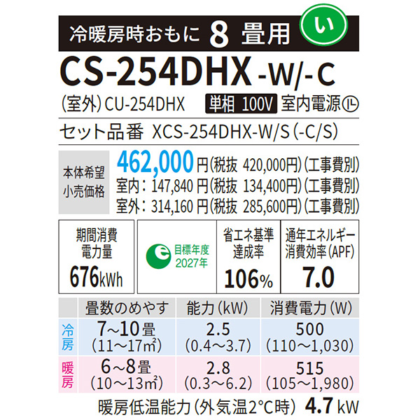 特記 東京ゼロエミポイント対象機種 カテゴリ ルームエアコン 型番 CS-254DHX-C 定価 420,000円 販売価格 税込 202,000円 送料 東京・神奈川全域:無料(一部地域や離島を除く) 詳細 ■メーカー:パナソニック ■モデル名:2024年モデル ■シリーズ名:Eolia HXシリーズ ■適用畳数:8畳用 ■カラー:ノーブルベージュ ■電源:単相100V ■室内機:CS-254DHX-C ■室外機:CU-254DHX ●室内機サイズ:高さ295mm×幅799mm×奥行385mm ●室外機サイズ:高さ630mm×幅799(バルブカバー68 / 取っ手部22)mm×奥行299(前面:吹き出しグリル33 / 脚部31)mm ■期間消費電力量(年間):676kWh ■その他機能等 ・ナノイーX(48兆)搭載 ・ナノイーX送風 ・においケア(ねらって脱臭) ・内部クリーン ・快適除湿(パーシャル) ・フィルターお掃除ロボット(自動排出 / ダストボックスへ切換可能) ・AI自動運転(新・AI快適おまかせ) ・空気清浄フィルター ・室温みはり ※記載された情報は商品仕様の一部ですので、詳細はメーカーサイトにてご確認ください。 ※標準取付工事のほか、家電量販店では対応困難な『隠ぺい配管工事』も承ります。