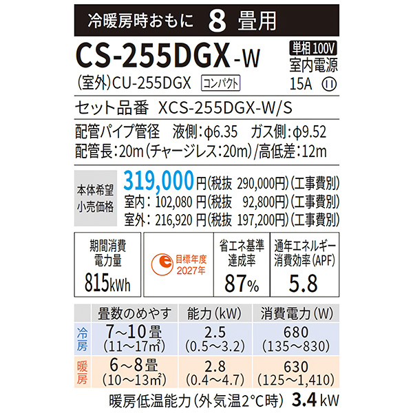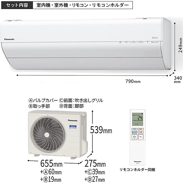 特記 東京ゼロエミポイント対象機種 カテゴリ ルームエアコン 型番 CS-255DGX-W 定価 290,000円 販売価格 税込 124,410円 送料 東京・神奈川全域:無料(一部地域や離島を除く) 詳細 ■メーカー:パナソニック ■モデル名:2025年モデル ■シリーズ名:Eolia GXシリーズ ■適用畳数:8畳用 ■カラー:クリスタルホワイト ■電源:単相100V ■室内機:CS-255DGX-W ■室外機:CU-255DGX ●室内機サイズ:高さ249×幅790×奥行340mm ●室外機サイズ:高さ539mm×幅655(バルブカバー60 / 取っ手部19)mm×奥行275(前面:吹き出しグリル39 / 脚部27)mm ■期間消費電力量(年間):815kWh ■その他機能等 ・ナノイーX 48兆 ・空気清浄フィルター ・フィルターお掃除ロボット(BOX) ・ナノイーX内部クリーン ・カビみはり(室内機内部) ・においケア ・除湿(快適/冷房/衣類乾燥) ・おへや学習機能 ・左右風向自動 ※記載された情報は商品仕様の一部ですので、詳細はメーカーサイトにてご確認ください。 ※標準取付工事のほか、家電量販店では対応困難な『隠ぺい配管工事』も承ります。