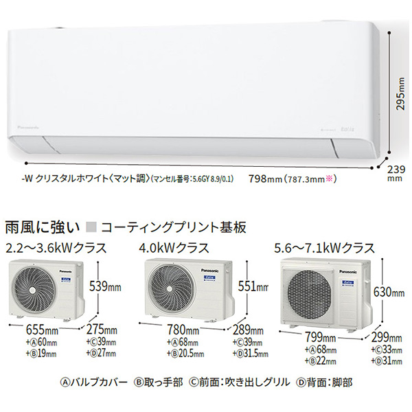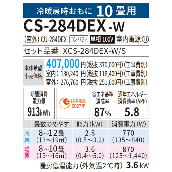 特記 東京ゼロエミポイント対象機種 カテゴリ ルームエアコン 型番 CS-284DEX-W 定価 370,000円 販売価格 税込 135,000円 送料 東京・神奈川全域:無料(一部地域や離島を除く) 詳細 ■メーカー:パナソニック ■モデル名:2024年モデル ■シリーズ名:Eolia EXシリーズ ■適用畳数:10畳用 ■カラー:クリスタルホワイト ■電源:単相100V ■室内機:CS-284DEX-W ■室外機:CU-284DEX ●室内機サイズ:高さ295mm×幅798(壁設置時787.3)mm×奥行239mm ●室外機サイズ:高さ539mm×幅655(バルブカバー60 / 取っ手部19)mm×奥行275(前面:吹き出しグリル39 / 脚部27)mm ■期間消費電力量(年間):913kWh ■その他機能等 ・ナノイーX(48兆)搭載 ・ナノイーX送風 ・においケア ・おでかけクリーン ・内部クリーン ・カビみはり(内部) ・フィルターお掃除ロボット(自動排出 / ダストボックスへ切換可能) ・AI自動運転 ・空気清浄フィルター ※記載された情報は商品仕様の一部ですので、詳細はメーカーサイトにてご確認ください。 ※標準取付工事のほか、家電量販店では対応困難な『隠ぺい配管工事』も承ります。