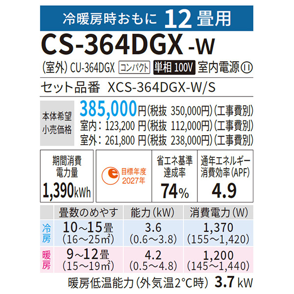 特記 東京ゼロエミポイント対象機種 カテゴリ ルームエアコン 型番 CS-364DGX-W 定価 350,000円 販売価格 税込 152,000円 送料 東京・神奈川全域:無料(一部地域や離島を除く) 詳細 ■メーカー:パナソニック ■モデル名:2024年モデル ■シリーズ名:Eolia GXシリーズ ■適用畳数:12畳用 ■カラー:クリスタルホワイト ■電源:単相100V ■室内機:CS-364DGX-W ■室外機:CU-364DGX ●室内機サイズ:高さ249mm×幅790mm×奥行340mm ●室外機サイズ:高さ539mm×幅655(バルブカバー60 / 取っ手部19)mm×奥行275(前面:吹き出しグリル39 / 脚部27)mm ■期間消費電力量(年間):1390kWh ■その他機能等 ・ナノイーX(48兆)搭載 ・ナノイーX送風 ・においケア ・おでかけクリーン ・内部クリーン ・カビみはり(内部) ・フィルターお掃除ロボット(ダストボックス) ・AI自動運転 ・空気清浄フィルター ※記載された情報は商品仕様の一部ですので、詳細はメーカーサイトにてご確認ください。 ※標準取付工事のほか、家電量販店では対応困難な『隠ぺい配管工事』も承ります。