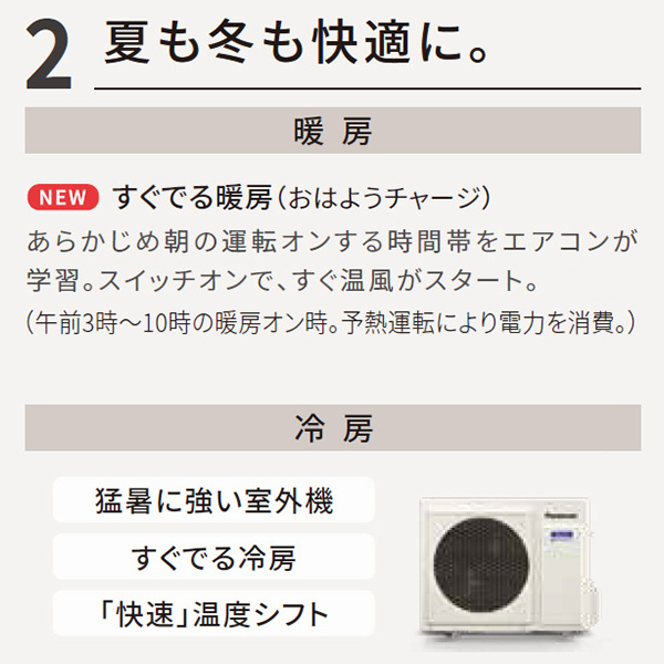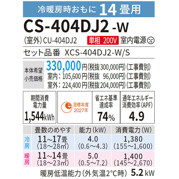 特記 東京ゼロエミポイント対象機種 カテゴリ ルームエアコン 型番 CS-404DJ2-W 定価 300,000円 販売価格 税込 116,000円 送料 東京・神奈川全域:無料(一部地域や離島を除く) 詳細 ■メーカー:パナソニック ■モデル名:2024年モデル ■シリーズ名:Eolia Jシリーズ ■適用畳数:14畳用 ■カラー:クリスタルホワイト ■電源:単相200V ■室内機:CS-404DJ2-W ■室外機:CU-404DJ2 ●室内機サイズ:高さ290mm×幅780mm×奥行229mm ●室外機サイズ:高さ551mm×幅780(バルブカバー68 / 取っ手部20.5)mm×奥行289(前面:吹き出しグリル39 / 脚部31.5)mm ■期間消費電力量(年間):1544kWh ■その他機能等 ・ナノイーX(9.6兆)搭載 ・ナノイーX送風 ・においケア ・快速温度シフト ・内部クリーン ・気流(上下左右自動) ・冷房除湿(2モード 除湿/弱) ・すぐでる冷房 ・すぐでる暖房(おはようチャージ) ※記載された情報は商品仕様の一部ですので、詳細はメーカーサイトにてご確認ください。 ※標準取付工事のほか、家電量販店では対応困難な『隠ぺい配管工事』も承ります。