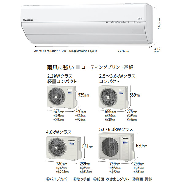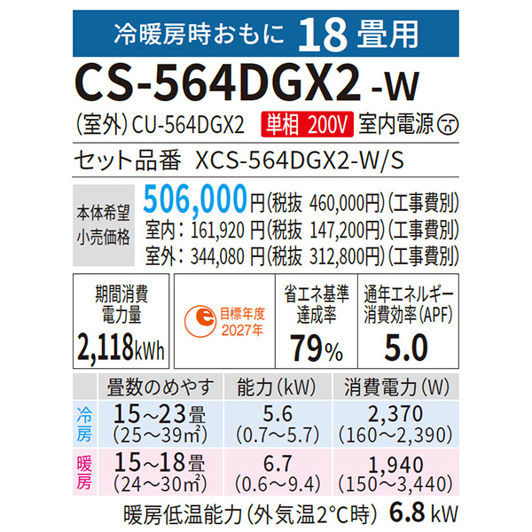 特記 東京ゼロエミポイント対象機種 カテゴリ ルームエアコン 型番 CS-564DGX2-W 定価 460,000円 販売価格 税込 200,000円 送料 東京・神奈川全域:無料(一部地域や離島を除く) 詳細 ■メーカー:パナソニック ■モデル名:2024年モデル ■シリーズ名:Eolia GXシリーズ ■適用畳数:18畳用 ■カラー:クリスタルホワイト ■電源:単相200V ■室内機:CS-564DGX2-W ■室外機:CU-564DGX2 ●室内機サイズ:高さ249mm×幅790mm×奥行340mm ●室外機サイズ:高さ630mm×幅799(バルブカバー68 / 取っ手部22)mm×奥行299(前面:吹き出しグリル33 / 脚部31)mm ■期間消費電力量(年間):2118kWh ■その他機能等 ・ナノイーX(48兆)搭載 ・ナノイーX送風 ・においケア ・おでかけクリーン ・内部クリーン ・カビみはり(内部) ・フィルターお掃除ロボット(ダストボックス) ・AI自動運転 ・空気清浄フィルター ※記載された情報は商品仕様の一部ですので、詳細はメーカーサイトにてご確認ください。 ※標準取付工事のほか、家電量販店では対応困難な『隠ぺい配管工事』も承ります。