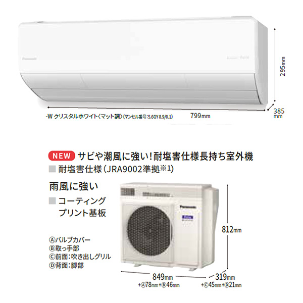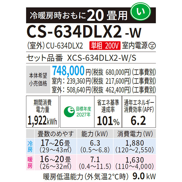 特記 東京ゼロエミポイント対象機種 カテゴリ ルームエアコン 型番 CS-634DLX2-W 定価 680,000円 販売価格 税込 378,000円 送料 東京・神奈川全域:無料(一部地域や離島を除く) 詳細 ■メーカー:パナソニック ■モデル名:2024年モデル ■シリーズ名:Eolia LXシリーズ ■適用畳数:20畳用 ■カラー:クリスタルホワイト ■電源:単相200V ■室内機:CS-634DLX2-W ■室外機:CU-634DLX2 ●室内機サイズ:高さ295mm×幅799mm×奥行385mm ●室外機サイズ:高さ812mm×幅849(バルブカバー78 / 取っ手部46)mm×奥行319(前面:吹き出しグリル45 / 脚部21)mm ■期間消費電力量(年間):1922kWh ■その他機能等 ・ナノイーX(48兆)搭載 ・ナノイーX送風 ・においケア(ねらって脱臭) ・内部クリーン ・加湿 ・快適除湿(パーシャル・ドライ給気) ・換気(給気 / 排気) ・フィルターお掃除ロボット(ダストボックス) ・AI自動運転(新・AI快適おまかせ) ※記載された情報は商品仕様の一部ですので、詳細はメーカーサイトにてご確認ください。 ※標準取付工事のほか、家電量販店では対応困難な『隠ぺい配管工事』も承ります。