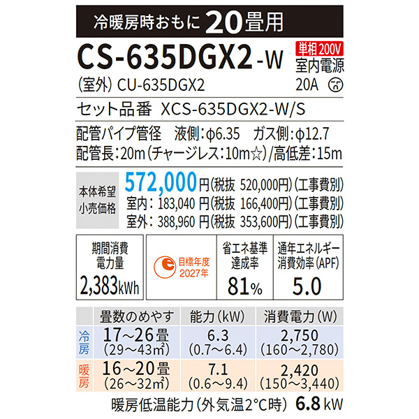 CS-635DGX2-W パナソニック ルームエアコン Eolia エオリア GXシリーズ 主に20畳用 クリスタルホワイト 2025年モデル ナノイーX(48兆) コンパクトモデル