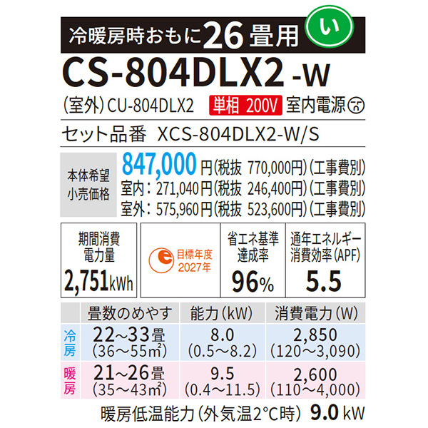 特記 東京ゼロエミポイント対象機種 カテゴリ ルームエアコン 型番 CS-804DLX2-W 定価 770,000円 販売価格 税込 428,000円 送料 東京・神奈川全域:無料(一部地域や離島を除く) 詳細 ■メーカー:パナソニック ■モデル名:2024年モデル ■シリーズ名:Eolia LXシリーズ ■適用畳数:26畳用 ■カラー:クリスタルホワイト ■電源:単相200V ■室内機:CS-804DLX2-W ■室外機:CU-804DLX2 ●室内機サイズ:高さ295mm×幅799mm×奥行385mm ●室外機サイズ:高さ812mm×幅849(バルブカバー78 / 取っ手部46)mm×奥行319(前面:吹き出しグリル45 / 脚部21)mm ■期間消費電力量(年間):2751kWh ■その他機能等 ・ナノイーX(48兆)搭載 ・ナノイーX送風 ・においケア(ねらって脱臭) ・内部クリーン ・加湿 ・快適除湿(パーシャル・ドライ給気) ・換気(給気 / 排気) ・フィルターお掃除ロボット(ダストボックス) ・AI自動運転(新・AI快適おまかせ) ※記載された情報は商品仕様の一部ですので、詳細はメーカーサイトにてご確認ください。 ※標準取付工事のほか、家電量販店では対応困難な『隠ぺい配管工事』も承ります。