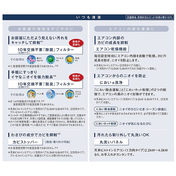 カテゴリ ハウジングエアコン 型番 CS-B281CC2-G 定価 330,000円 販売価格 税込 133,000円(銀行振込用特価) 詳細 ■メーカー:パナソニック ■タイプ名:天井ビルトイン1方向 ■適用畳数:10畳用 ■化粧グリルカラー:CZ-BT10-W(ホワイト) / CZ-BT10-T(ブラウン) / CZ-BT10-M(木目調:12,000円追加) ■電源:単相200V ■室内機:CS-B281CC2 ■室外機:CU-B281CG2 ●室内機サイズ:高さ185mm×幅770mm×奥行360mm ●室外機サイズ:高さ540mm×幅780(+92.5)mm×奥行289(+56)mm ■期間消費電力量(年間):999kWh ■その他機能等 ・室外電源 ・10年交換不要「除菌」フィルター ・10年交換不要「脱臭」フィルター ・エアコン乾燥機能 ・においま洗浄 ・におい除去運転 ・においカット制御 ・丸洗いパネル ※記載された情報は商品仕様の一部ですので、詳細はメーカーサイトにてご確認ください。 ※標準取付工事のほか、家電量販店では対応困難な『隠ぺい配管工事』も承ります。