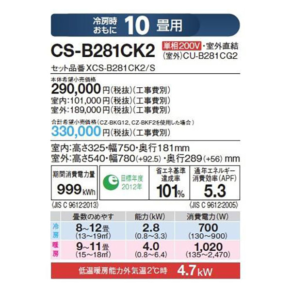 カテゴリ ハウジングエアコン 型番 CS-B281CK2-G 定価 330,000円 販売価格 税込 133,000円(銀行振込用特価) 詳細 ■メーカー:パナソニック ■タイプ名:壁ビルトイン ■適用畳数:10畳用 ■化粧グリルカラー:CZ-BKG12(和風グリル) / CZ-BKG13(洋風グリル) / CZ-BKG14(和風グリル 総檜製) ■電源:単相200V ■室内機:CS-B281CK2 ■室外機:CU-B281CG2 ●室内機サイズ:高さ325mm×幅750mm×奥行181mm ●室外機サイズ:高さ540mm×幅780(+92.5)mm×奥行289(+56)mm ■期間消費電力量(年間):999kWh ■その他機能等 ・室外電源 ・除菌フィルター(交換めやす約10年) ・脱臭フィルター(交換めやす約10年) ・エアコン乾燥機能 ・においま洗浄 ・カビストッパー(別売) ・シリコンコーティングプリント基板(室外機) ・同時入り切りタイマー(リモコン) ・エアコンリプレース ※記載された情報は商品仕様の一部ですので、詳細はメーカーサイトにてご確認ください。 ※標準取付工事のほか、家電量販店では対応困難な『隠ぺい配管工事』も承ります。