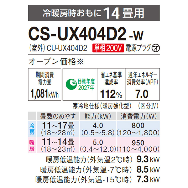 カテゴリ ルームエアコン 型番 CS-UX404D2-W 定価 オープン価格 販売価格 税込 250,000円 送料 東京・神奈川全域:無料(一部地域や離島を除く) 詳細 ■メーカー:パナソニック ■モデル名:2024年モデル ■シリーズ名:Eolia エオリア UXシリーズ ■適用畳数:14畳用 ■カラー:クリスタルホワイト ■電源:単相200V ■室内機:CS-UX404D2-W ■室外機:CU-UX404D2 ●室内機サイズ:高さ295mm×幅799mm×奥行385mm ●室外機サイズ:高さ699mm×幅849(バルブカバー68 / 取っ手部22)mm×奥行319(前面:吹き出しグリル45 / 脚部21)mm ■期間消費電力量(年間):1081kWh ■その他機能等 ・ナノイーX(48兆) ・おでかけクリーン ・空気清浄フィルター ・フィルターお掃除ロボット(自動排出/BOX切替) ・内部クリーン(カビ菌の除菌) ・すぐでる暖房(AIチャージ) ・すぐでる冷房 ・快適除湿(選べるしつど) ・おへや学習機能 ※記載された情報は商品仕様の一部ですので、詳細はメーカーサイトにてご確認ください。 ※標準取付工事のほか、家電量販店では対応困難な『隠ぺい配管工事』も承ります。