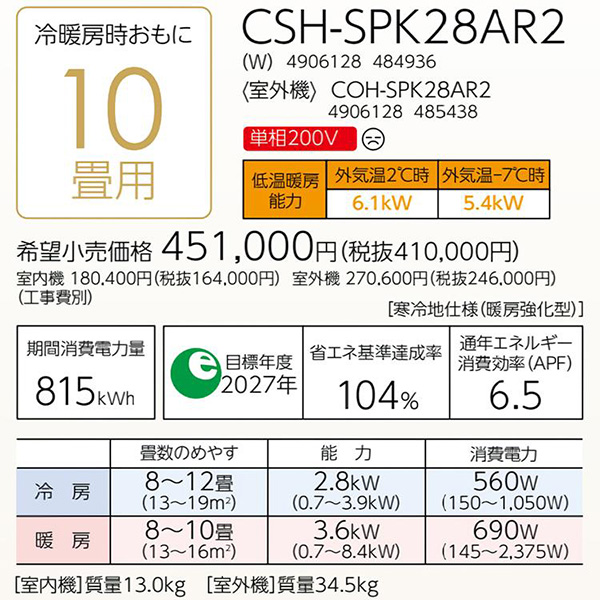 特記 東京ゼロエミポイント対象機種 カテゴリ ルームエアコン 型番 CSH-SPK28AR2-W 定価 410,000円 販売価格 税込 191,000円 送料 東京・神奈川全域:無料(一部地域や離島を除く) 詳細 ■メーカー:コロナ ■モデル名:2024年モデル ■シリーズ名:ReLaLa 冬暖 SPKシリーズ ■適用畳数:10畳用 ■カラー:ホワイト ■電源:単相200V ■室内機:CSH-SPK28AR2-W ■室外機:COH-SPK28AR2 ●室内機サイズ:高さ295mm×幅797mm×奥行369mm ●室外機サイズ:高さ533mm×幅780(+73)mm×奥行278mm ■期間消費電力量(年間):815kWh ■その他機能等 ・寒冷地仕様 ・ノンストップ暖房 ・凍結防止ヒーター搭載(室外機) ・暖速モード ・自動運転 ・よごれま扇 ・人感センサー ・フィルター自動おそうじ ・内部乾燥モード ※記載された情報は商品仕様の一部ですので、詳細はメーカーサイトにてご確認ください。 ※標準取付工事のほか、家電量販店では対応困難な『隠ぺい配管工事』も承ります。