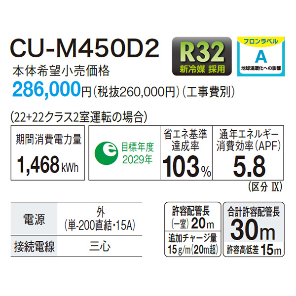 カテゴリ ハウジングエアコン 型番 CU-M450D2 定価 260,000円 販売価格 税込 105,000円 詳細 ■メーカー:パナソニック ■タイプ名:2室用室外機 ■カラー:ホワイト ■電源:単相200V ■室内機:なし ■室外機:CU-M450D2 ●室内機サイズ:- ●室外機サイズ:高さ619mm×幅824(バルブカバー69 / 取っ手部22)mm×奥行299(前面:吹出しグリル37 / 背面:脚部32)mm ■期間消費電力量(年間):1468kWh ■その他機能等 ・室外電源 ※記載された情報は商品仕様の一部ですので、詳細はメーカーサイトにてご確認ください。 ※標準取付工事のほか、家電量販店では対応困難な『隠ぺい配管工事』も承ります。
