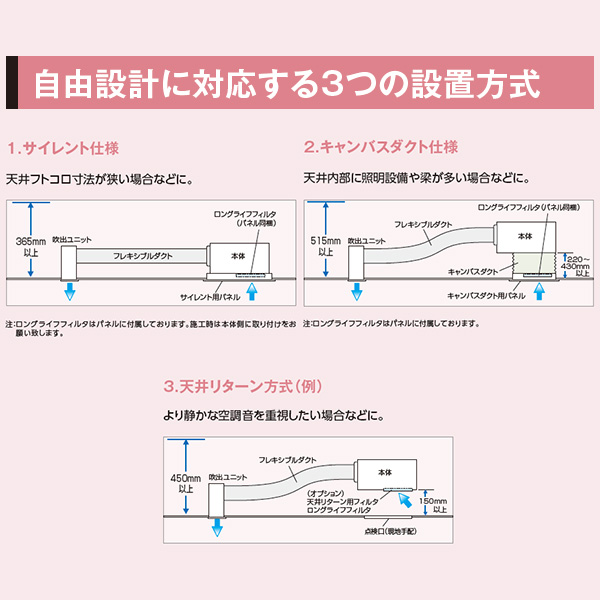 ●室内機サイズ:キャンバスダクト仕様 本体:高さ348+α×幅950mm×奥行635mm / パネル:高さ20mm×幅1064mm×奥行585mm ●室内機サイズ:サイレント仕様 本体:高さ348×幅950mm×奥行635mm / パネル:高さ20mm×幅1240mm×奥行750mm |