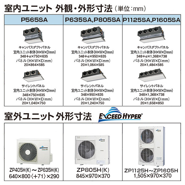 ●室内機サイズ:キャンバスダクト仕様 本体:高さ348+α×幅950mm×奥行635mm / パネル:高さ20mm×幅1064mm×奥行585mm ●室内機サイズ:サイレント仕様 本体:高さ348×幅950mm×奥行635mm / パネル:高さ20mm×幅1240mm×奥行750mm |