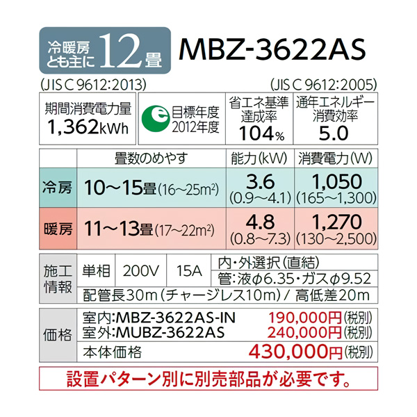 カテゴリ ハウジングエアコン 型番 MBZ-3622AS 定価 430,000円 販売価格 税込 137,000円 送料 東京・神奈川全域:無料(一部地域や離島を除く) 詳細 ■メーカー:三菱電機 ■モデル名:2022年モデル ■タイプ名:フリービルトイン ■シリーズ名:霧ヶ峰 ■適用畳数:12畳用 ■電源:単相200V ■室内機:MBZ-3622AS-IN ■室外機:MUBZ-3622AS ●室内機サイズ:高さ230mm×幅770(据付後835)mm×奥行450mm ●室外機サイズ:高さ550mm×幅800(+62)mm×奥行285(+60)mm ■期間消費電力量(年間):1362kWh ■その他機能等 ・STRONG冷房 ・選べる3モード除湿 ・室温キープシステム ・高天井モード ・おこのみ運転 ・ねむり運転 ・操作音階 ・週間スケジュールタイマー ・プラチナエアフィルター(別売部品に同梱) ※記載された情報は商品仕様の一部ですので、詳細はメーカーサイトにてご確認ください。 ※標準取付工事のほか、家電量販店では対応困難な『隠ぺい配管工事』も承ります。