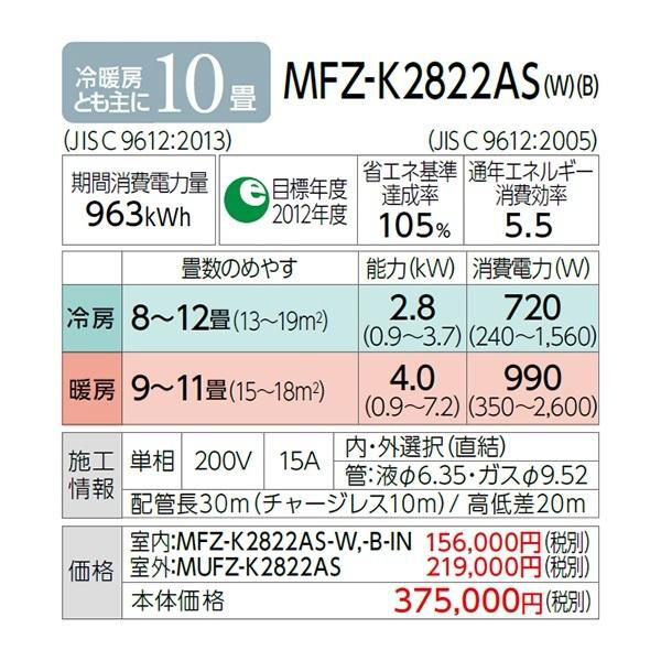 カテゴリ ハウジングエアコン 型番 MFZ-K2822AS-B 定価 410,000円 販売価格 税込 130,000円 送料 東京・神奈川全域:無料(一部地域や離島を除く) 詳細 ■メーカー:三菱電機 ■モデル名:2022年モデル ■タイプ名:床置き形 ■シリーズ名:霧ヶ峰 Kシリーズ ■適用畳数:10畳用 ■カラー:ダークブラウン ■電源:単相200V ■室内機:MFZ-K2822AS-W ■室外機:MUFZ-K2822AS ●室内機サイズ:高さ600mm×幅750mm×奥行215mm ●室外機サイズ:高さ550mm×幅800(+62)mm×奥行285(+60)mm ■期間消費電力量(年間):963kWh ■その他機能等 ・オートフラップ ・上下涼感スイング ・プラチナエアフィルター ・STRONG冷房 ・選べる3モード除湿 ・空清Vフィルター ・室温キープシステム ・急速Wヒート ・おこのみ運転 ※記載された情報は商品仕様の一部ですので、詳細はメーカーサイトにてご確認ください。 ※標準取付工事のほか、家電量販店では対応困難な『隠ぺい配管工事』も承ります。