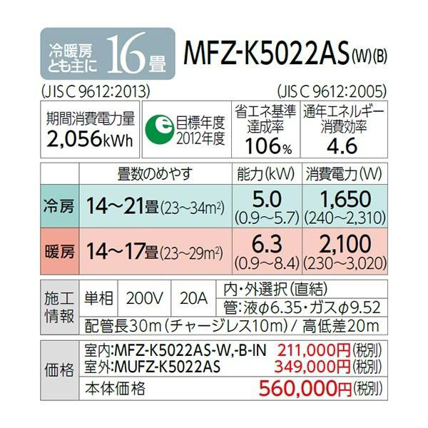 カテゴリ ハウジングエアコン 型番 MFZ-K5022AS-W 定価 616,000円 販売価格 税込 195,000円 詳細 ■メーカー:三菱電機 ■モデル名:2022年モデル ■シリーズ名:霧ヶ峰 Kシリーズ ■タイプ名:床置き形 ■適用畳数:16畳用 ■カラー:ホワイト ■電源:単相200V ■室内機:MFZ-K5022AS-W ■室外機:MUFZ-K5022AS ●室内機サイズ:高さ600mm×幅750mm×奥行215mm ●室外機サイズ:高さ550mm×幅800(+62)mm×奥行285(+60)mm ■期間消費電力量(年間):2056kWh ■その他機能等 ・オートフラップ ・上下涼感スイング ・プラチナエアフィルター ・STRONG冷房 ・選べる3モード除湿 ・空清Vフィルター ・室温キープシステム ・急速Wヒート ・おこのみ運転 ※記載された情報は商品仕様の一部ですので、詳細はメーカーサイトにてご確認ください。 ※標準取付工事のほか、家電量販店では対応困難な『隠ぺい配管工事』も承ります。