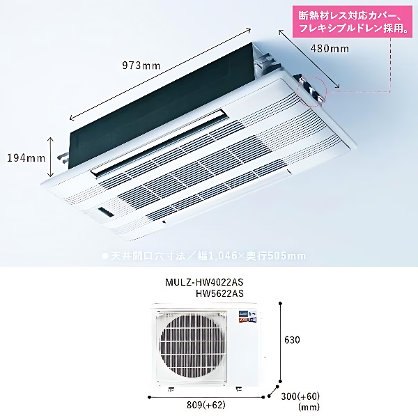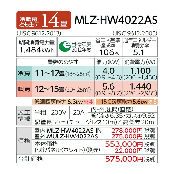 カテゴリ ハウジングエアコン 型番 MLZ-HW4022AS 定価 575,000円 販売価格 税込 284,000円 送料 東京・神奈川全域:無料(一部地域や離島を除く) 詳細 ■メーカー:三菱電機 ■モデル名:2022年モデル ■タイプ名:天井埋込形2方向 ■シリーズ名:霧ヶ峰 ズバ暖 HWシリーズ ■適用畳数:14畳用 ■電源:単相200V ■室内機:MLZ-HW4022AS-IN ■室外機:MULZ-HW4022AS ●室内機サイズ:高さ194mm×幅973mm×奥行480mm ●室外機サイズ:高さ630mm×幅809(+62)mm×奥行300(+60)mm ■期間消費電力量(年間):1484kWh ■その他機能等 ・寒冷地仕様 ・高温みまもり ・最高約60℃温風 ・長時間連続暖房 ・室温キープシステム ・STRONG冷房 ・上下左右涼感スイング ・選べる3モード除湿 ・プラチナエアフィルター ・はずせるボディ ※記載された情報は商品仕様の一部ですので、詳細はメーカーサイトにてご確認ください。 ※標準取付工事のほか、家電量販店では対応困難な『隠ぺい配管工事』も承ります。