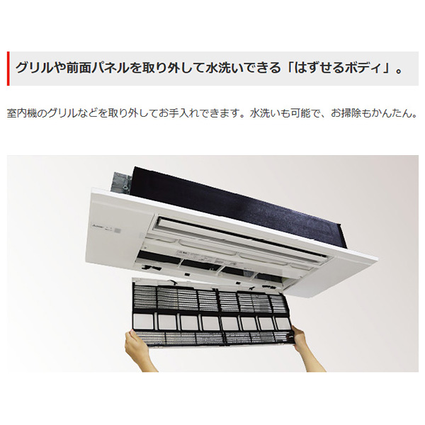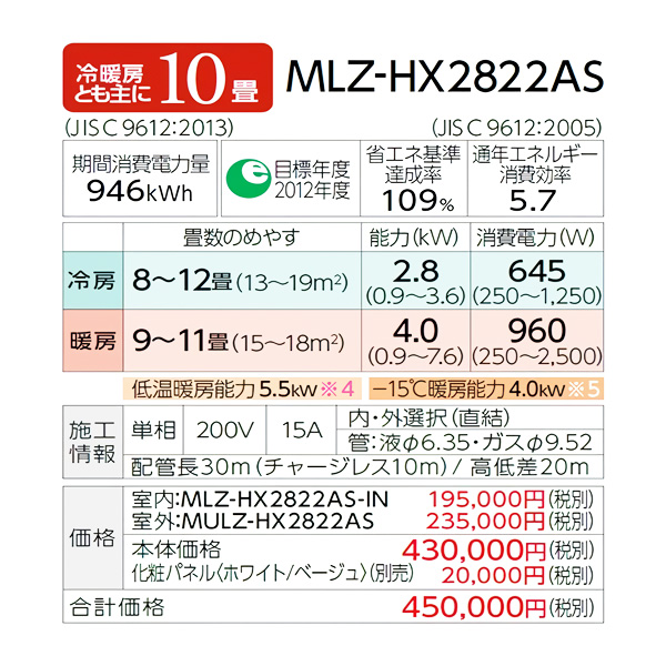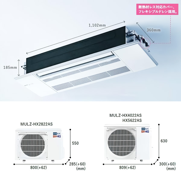 カテゴリ ハウジングエアコン 型番 MLZ-HX2822AS 定価 450,000円 販売価格 税込 223,000円 送料 東京・神奈川全域:無料(一部地域や離島を除く) 詳細 ■メーカー:三菱電機 ■モデル名:2022年モデル ■タイプ名:天井埋込形1方向 ■シリーズ名:霧ヶ峰 ズバ暖 HXシリーズ ■適用畳数:10畳用 ■電源:単相200V ■室内機:MLZ-HX2822AS-IN ■室外機:MULZ-HX2822AS ●室内機サイズ:高さ185mm×幅1102mm×奥行360mm ●室外機サイズ:高さ550mm×幅800(+62)mm×奥行285(+60)mm ■期間消費電力量(年間):946kWh ■その他機能等 ・寒冷地仕様 ・高温みまもり ・長時間連続暖房 ・室温キープシステム ・凍結防止ヒーター ・STRONG冷房 ・上下左右涼感スイング ・選べる3モード除湿 ・空清Vフィルター ※記載された情報は商品仕様の一部ですので、詳細はメーカーサイトにてご確認ください。 ※標準取付工事のほか、家電量販店では対応困難な『隠ぺい配管工事』も承ります。